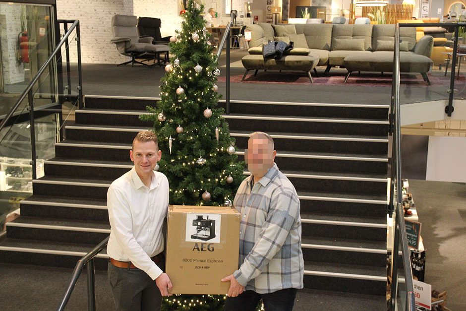 Marburg-Wehrda (sr). Im Dezember verloste das Einrichtungshaus ALKONI im Rahmen des Gewinnspiels der Geschäfte im Kaufpark Wehrda in Kooperation mit dem Sonntag-Morgenmagazin eine Espresso Siebträgermaschine der Marke AEG im Wert von 499 Euro (UVP).